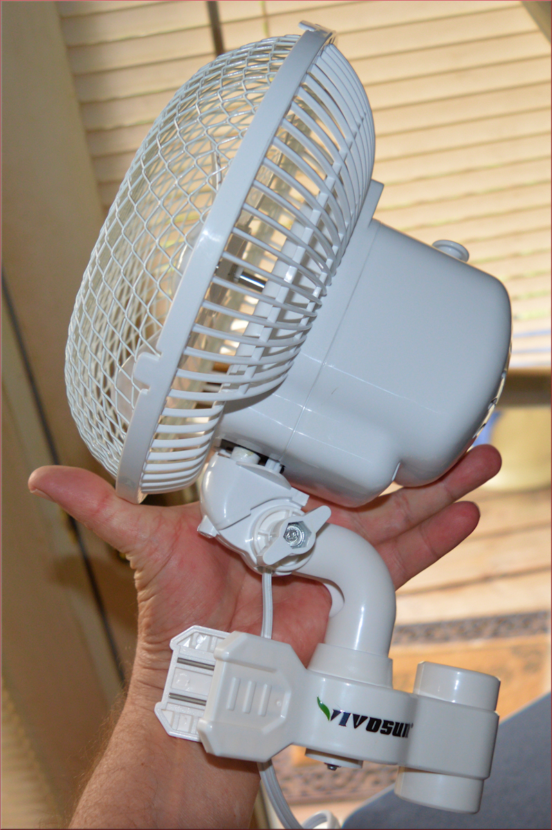 Currently and for the last many years, in my tents, for my fans that provide constant air circulation (24/7), I use these little cheap clip-on fans that last about one year before they die and need replaced. I place these fans up high in the tents, not aimed directly at my plants and it works well. But now, with these cool oscillating fans that clip to the tent poles with high stability, I can actually have the fans placed to sweep across the plants—which is very nice. You never want to have a stationary fan aimed directly at your plants, otherwise you will hyper-dehydrate them; especially running a low humidity.