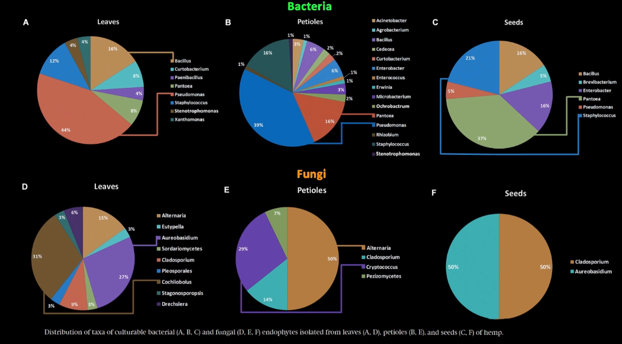 Several culturable microbial populations have been found in empirical research to associate with Cannabis already. In one study regarding industrial hemp endophytes in CRS-1, Anka, and Yvonne, the most common bacteria encountered were Bacillus and Pseudomonas in leaves, Pantoea and Pseudomonas in the petioles connecting leaves to stems, with seeds encountering Pantoea and Staphylococcus primarily. Endophytic fungi most prominently found in Cannabis leaves were Cochliobolus and Aureobasidium, Alternaria and Cryptococcus in the petioles, and only were Cladosporium and Aureobasidium found in the seeds at equal levels. Several of these groups contain both mutualistic and parasitic species and strains, and bacterial populations evaluated tended to come from the alpha-proteobacteria and gamma-proteobacteria, though 18 different bacterial genera and 14 different fungal genera were found in Cannabis tissues. Bacillus, Enterobacter, Enterococcus, and Pseudomonas were found that could make enzymes that break down cellulose and inorganic phosphate more soluble in water, as well as those that could chelate iron and produce the plant hormone indole acetic acid. Clearly, these traits can have physiological effects on the development of their host.